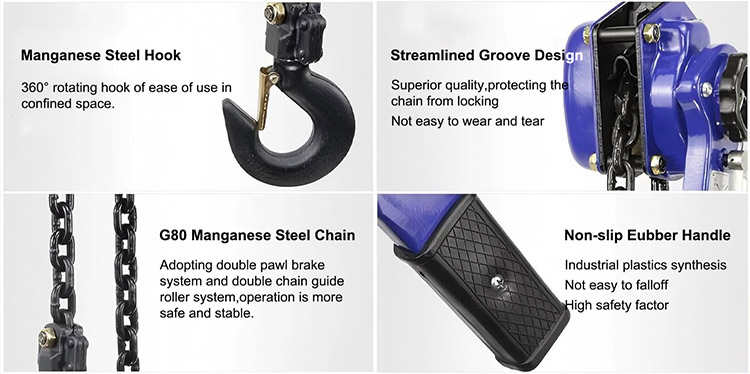 2. Altura de elevação padrão: 1,5 m, 3 m, 6 m, 10m, 20m, etc. (comprimento de corrente única). O comprimento da corrente pode ser personalizado.