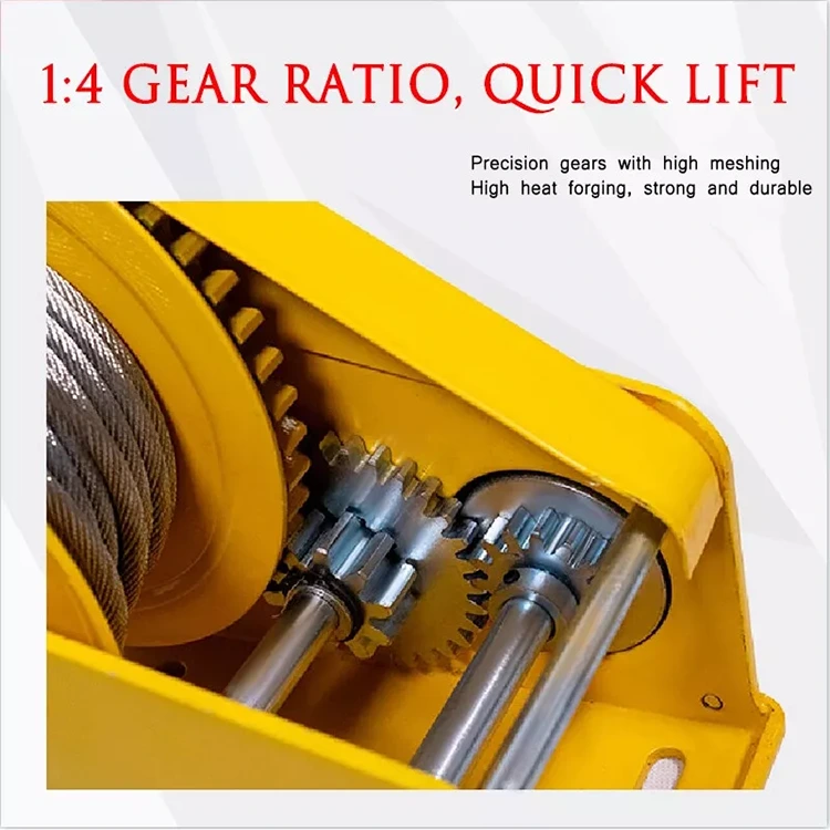Quando você agita a alça, a potência é transmitida através de múltiplas engrenagens, convertendo sua pequena força rotacional em um enorme torque no tambor de aço, conseguindo assim o efeito de "quatro ou dois levantando mil libras".
