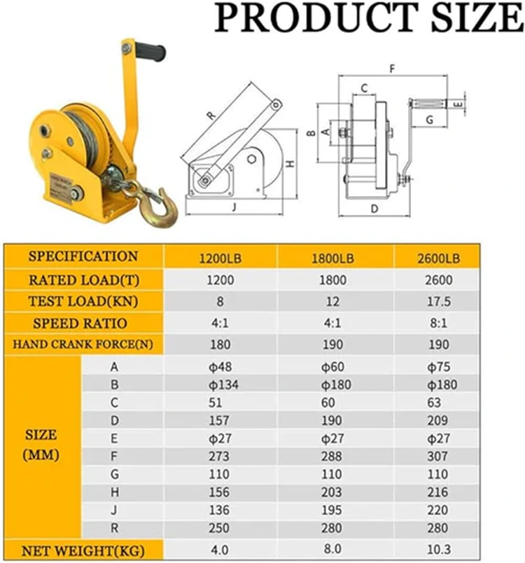 O guincho manual tem estrutura compacta e poucas peças, por isso é pequeno em tamanho e leve. Uma pessoa pode levantá-lo e movê-lo facilmente para onde você precisar, e a configuração é rápida e fácil. Essa extrema portabilidade o torna ideal para ferramentas em veículos, armazenamento de kits de emergência e trabalhadores ao ar livre.